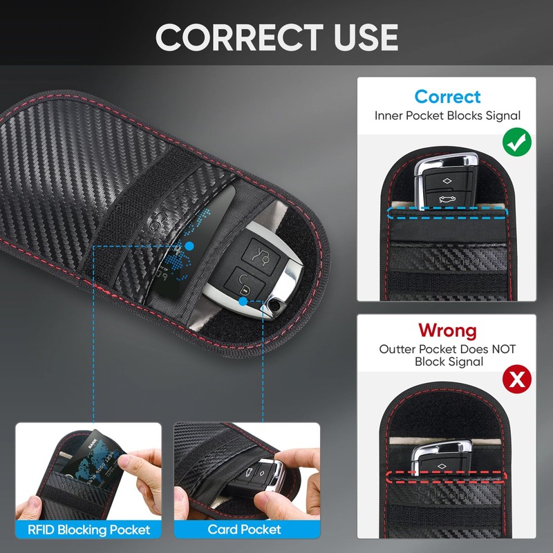 • CONVENIENCE The smaller/front pocket is anti-radiation, best for storing ID card, bank cards, etc. The larger/back pocket is for signal blocking, best for storing car key fobs