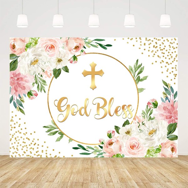 Ticuenicoa 7x5ft Pink Floral God Bless Baptism Backdrop for Girl First Communion Background Gold Glitter Dots Christening Baby Shower Party Decorations Banner Photo Favors