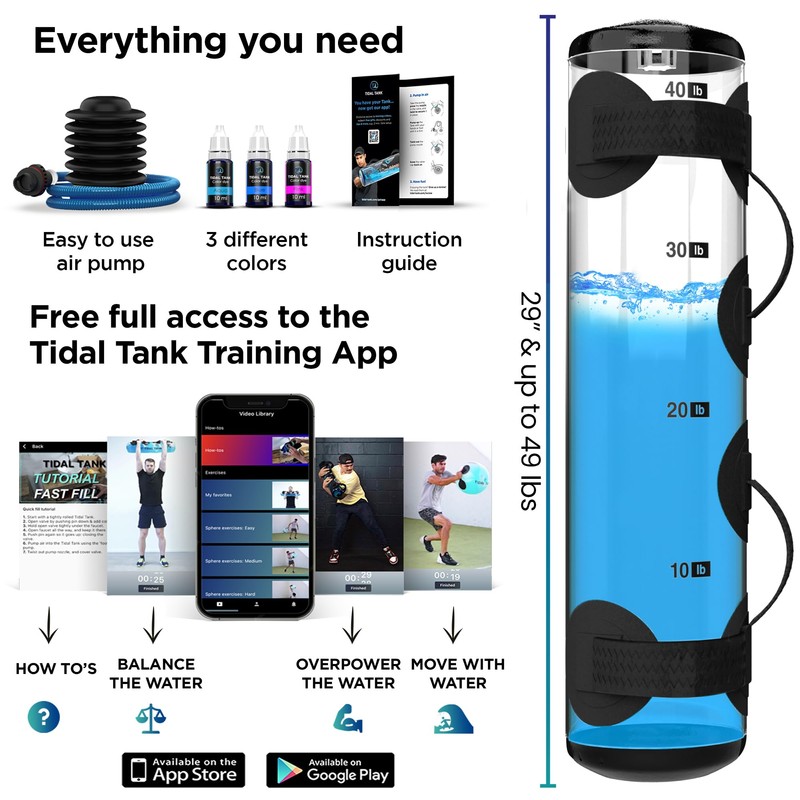 - ONLY WITH THE TIDAL TANK: EVERYTHING YOU NEED 🌊 We are fully focused on the Tidal Tank, and want to give you everything you may need, in one purchase. So we made the Tidal Tank transparent, allowing you to see the water level, and included a handy water level to weight indicator so you can see how many pounds of water to add. Furthermore, you will get FREE APP ACCESS with many exercises for your inspiration. Not satisfied for any reason? RETURN FOR FREE within 30 days.