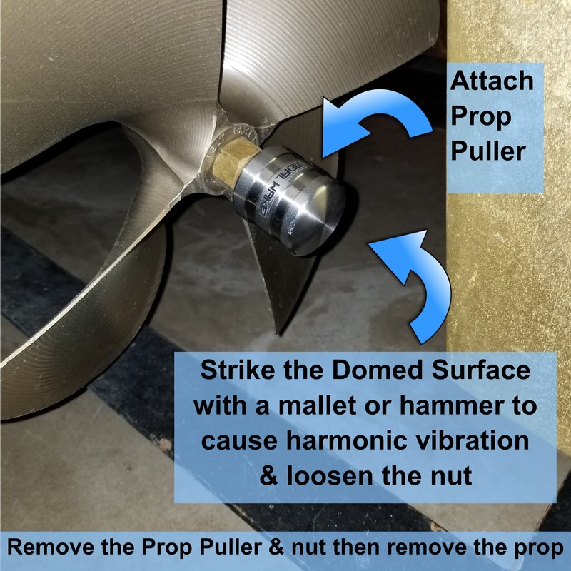 - DITCH THE CLUMSY C-CLAMP METHOD - No need for a helper and c-clamps that may not work on your style of prop! Tidal Wake Prop Puller is as EZ as 1, 2, 3! 1. Screw Prop Puller on propeller shaft. 2. Strike domed top with a hammer or mallet. 3. Watch the Harmonic Vibrations loosen the prop for removal. That's it! PRO-TIP - turn the steering wheel so the rudder allows you better access for a better angle on your hit. For Stubborn Props, try backing it off 1/4 turn before hitting.