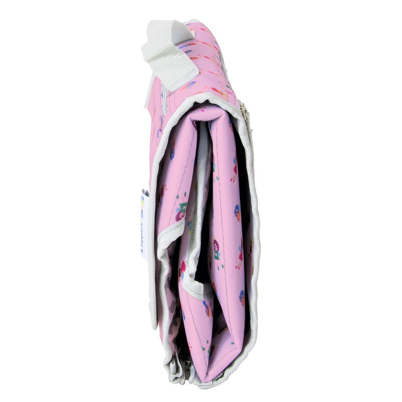 - COMPACT & FLEXIBLE - Features 2 large outer zipper pockets, convenient for keys, phones, cards and other personal items, or extra diapers and dry clothes. Internal zippered mesh pocket for nappies, wipes, creams and bags. Plus 2 elastic straps for attaching additional items. Integrated Velcro closure for easy closure. Small pack size (dimensions when closed = 30 cm x 22 cm x 3 cm).