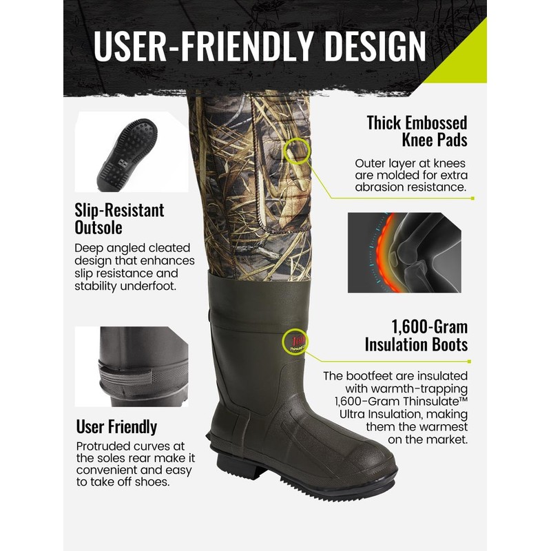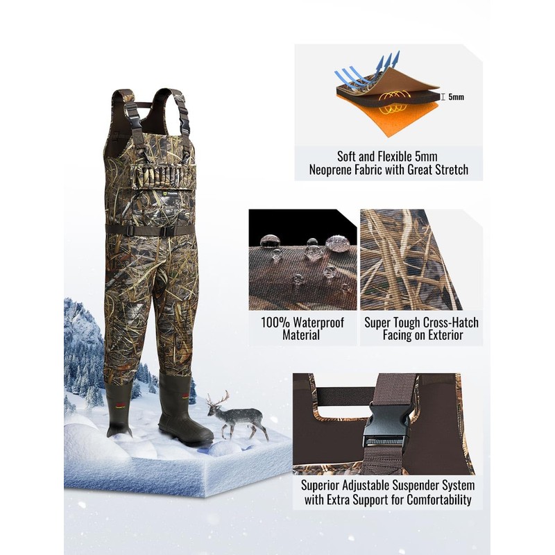 - 【Wear-resistant & Comfortable】Super tough cross-hatch facing on the exterior makes the hunting wader extra solid. Built-in rubber boot is comfortable and can be worn with or without socks. Our rugged boot tread pattern provides you with better balance and traction on wet and muddy surfaces.