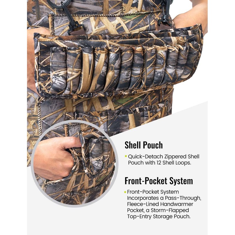 - 【User-Friendly】To keep your ammunition, choke tubes and other small accessories close, we included a quick-detach shell pouch with 12 shell loops. Our front-pocket system incorporates a pass-through, fleece-lined handwarmer pocket, a storm-flapped top-entry storage pouch and three front compartments for convenient access to your calls. The handwarmer pocket has a heat-pack pocket that hangs freely at your fingertips.