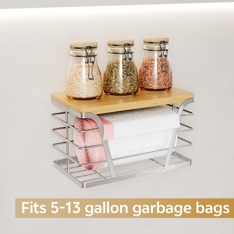 - TRASH BAG ORGANIZER: Includes a grocery bag holder with bamboo lid and adhesive for easy installation; wall-mounted design maximizes space in laundry room and kitchen; perfect for storing garbage bags or using the bamboo lid as an extra shelf for groceries and other small items