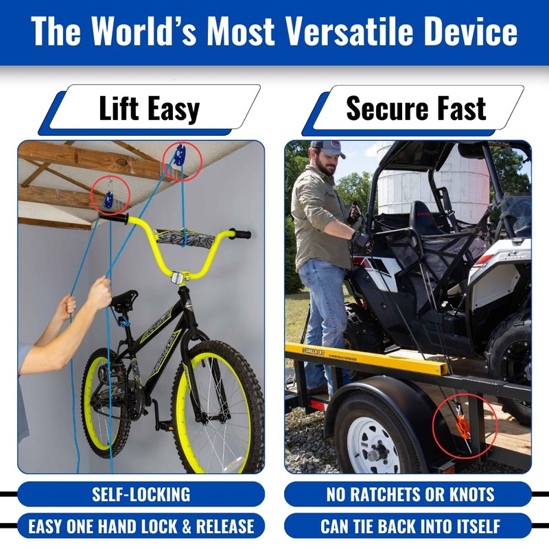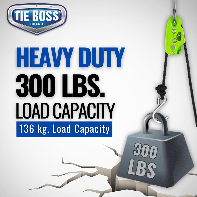 - HOIST THINGS WITH EASE: Tie Boss is perfect for hoisting and storing cargo up in a garage because they are self locking. Whenever your cargo is hoisted to your desired height let go, and the rope will catch in the jam cleat. To release it, no buttons or ladders need to be used. Simply lift the rope out to a 20 degree angle and lower your cargo.