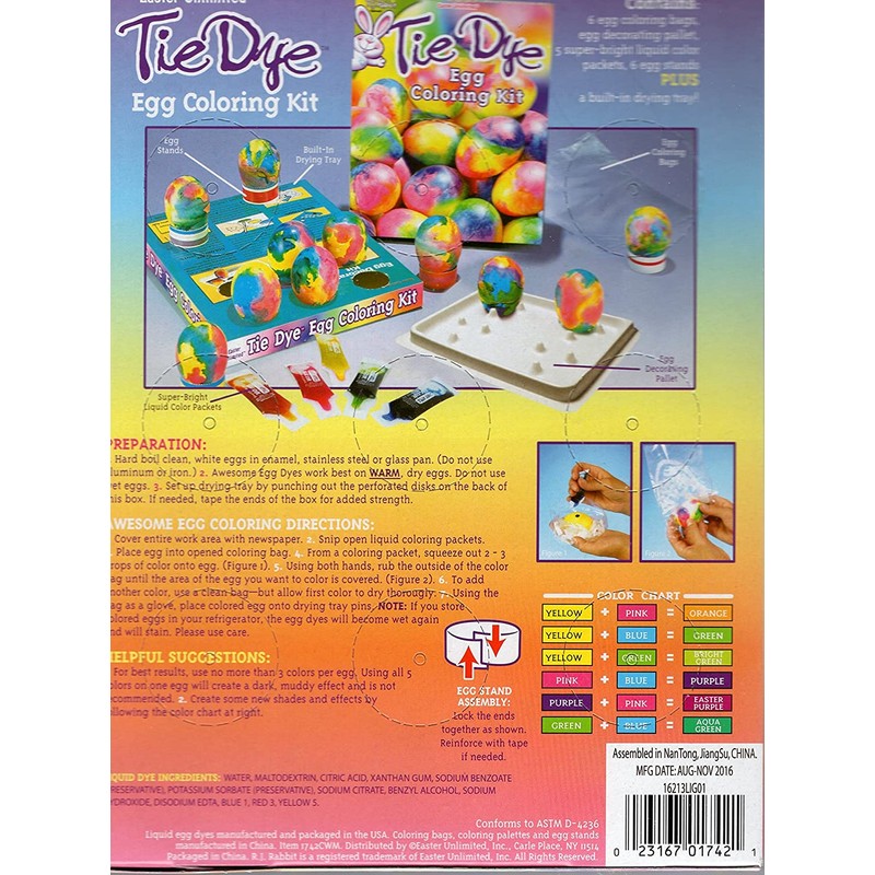 included. 5 color droppers. 6 coloring bags. 1 coloring palette. 6 egg stands.
