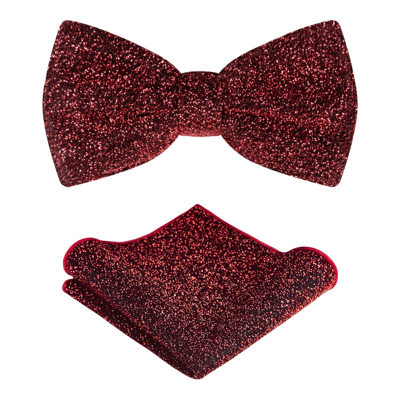 TIE G Men's Glitter Velvet Bow Tie + Pocket Square Set in Gift Box for Wedding, Party : Glittering Effects, Unisex Design (Twinkling Wine)