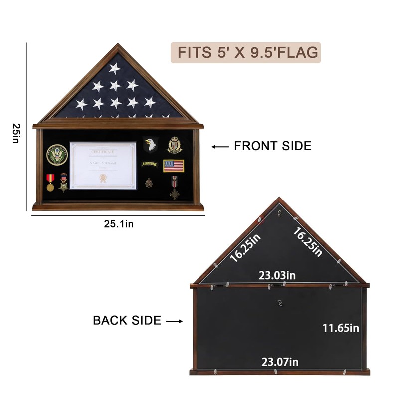 - 5’ x 9. 5’ Folded Flag Display Case - Top triangle area of this military shadow box is to store a 5' X 9.5' flag for a Funeral Service. Bottom shadow box to display certificate document, shoulder flags, medal, coins and pins. The top triangle area for the flag storage is 23.03"W X 16.25"H X 2.1"D. Not Work for the 3'x5' or the 4'x6' flag. Outside Dimensions: 25"H X 25.1"W X 3.6"D
