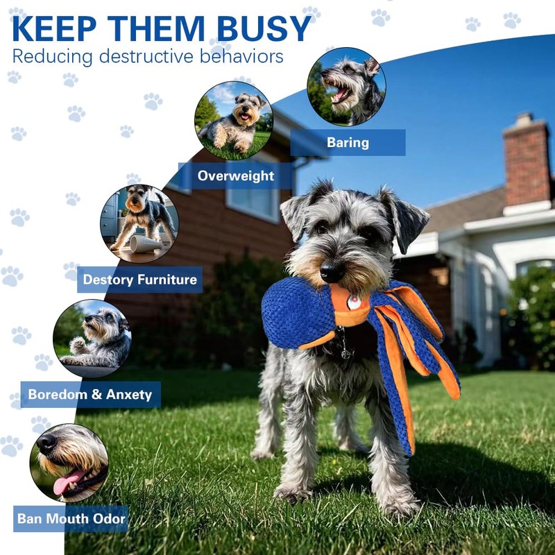 - INTERACTIVE SQUEAKY DOG TOY: This blue octopus dog toy is equipped with 2 built-in squeakers that create fun sounds when your dog bites or plays with it, keeping them entertained for hours. The lifelike eyes and vibrant design awaken your dog’s hunting instincts, offering an exciting way to release pent-up energy, reduce loneliness, and minimize destructive behaviors like chewing or barking.