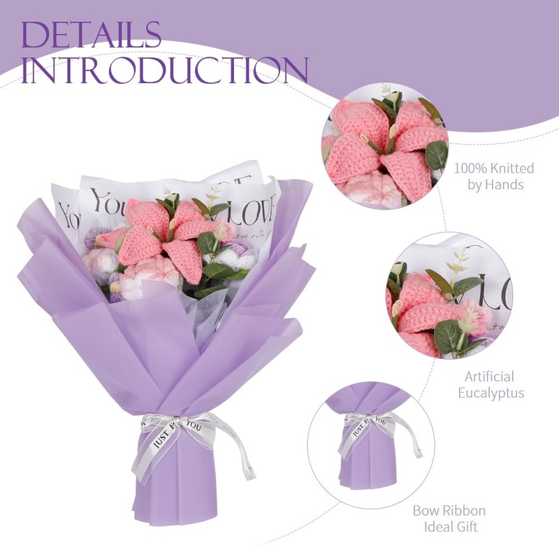 Tifflake Large Crochet Flower Bouquet Tulip Rose Carnation: Completed Knitted Flowers for Thanksgiving Graduation Birthday Home Decor (Purple)