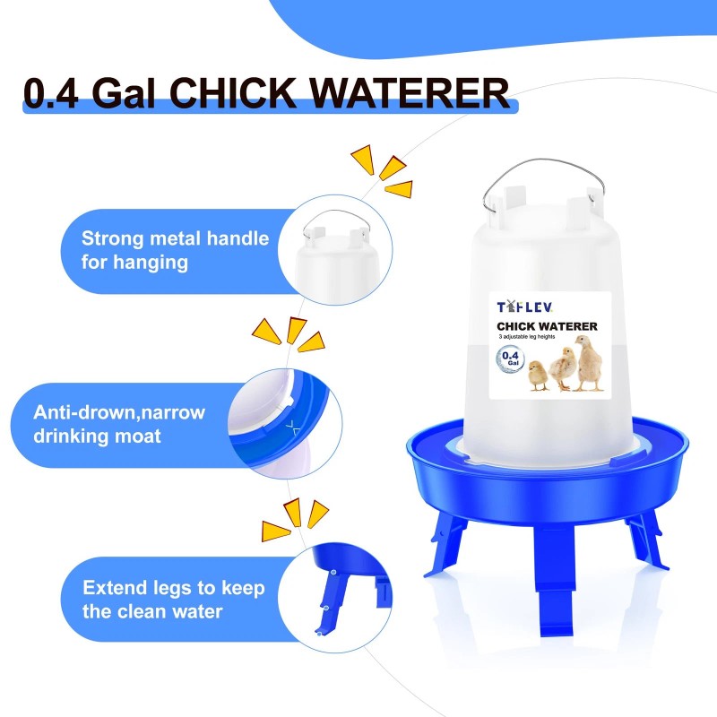 Height adjustable: It meets the needs of chicks of different ages from 1 to 12 weeks. Also, raising them to a certain height prevents the chicks from getting wood chips or weeds into the food or water