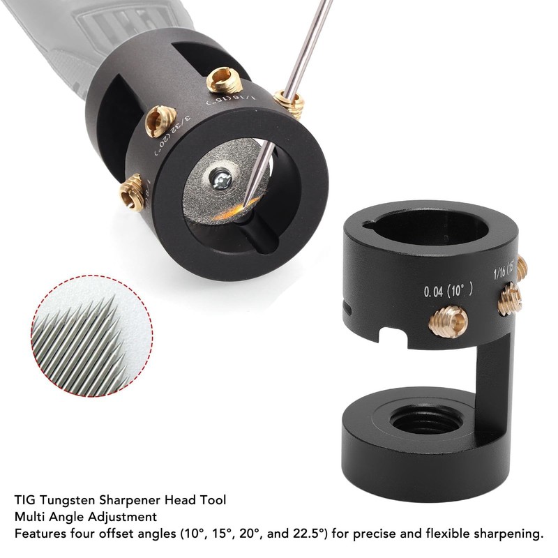 - Multi Angle Adjustment: The tungsten grinder Heads features four different offset angles (10°, 15°, 20°, and 22.5°), allowing for flexible and precise sharpening of tungsten electrodes to achieve optimal welding performance.