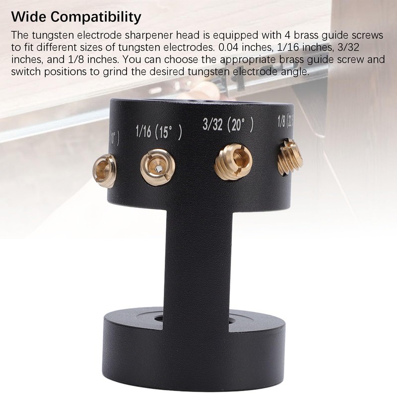 - Wide Compatibility: The tungsten electrode sharpener Heads is equipped with 4 brass Guides screws to fit different sizes of tungsten electrodes. 0.04 inches, 1/16 inches, 3/32 inches, and 1/8 inches. You can choose the appropriate brass Guides screw and switch positions to grind the desired tungsten electrode angle.