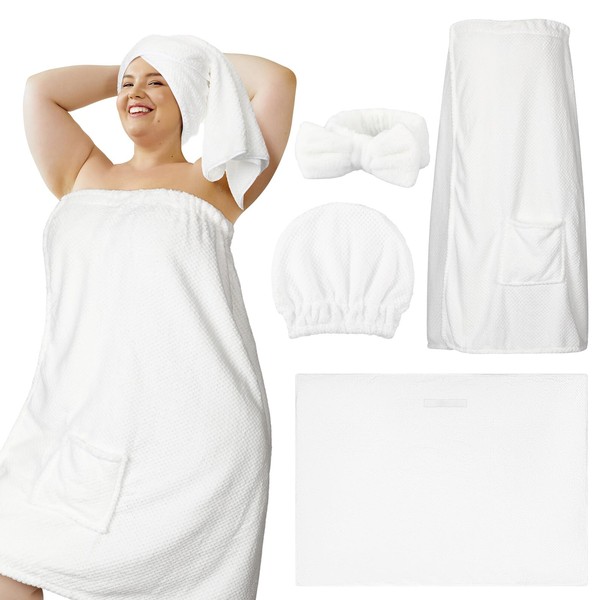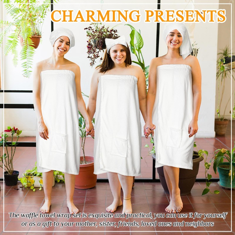 - Plus Size Bath Skirt Set: you will receive 1 oversized adjustable bath skirt, 1 dry hair towel, 1 dry hair cap and 1 face washing headband with bow, the rich bulk is very suitable for spa, sauna, beach vacation, swimming, gym, daily shower and other scenes, and it is also a good choice for gifts