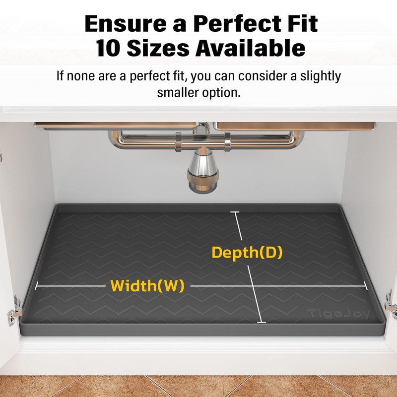 - CHOOSE YOUR SIZE: With multiple sizes available, the TigeJoy sink liners fit various kitchen and bathroom cabinets. Double-check your measurements before ordering. If an exact fit isn’t available, consider mats slightly smaller than your cabinet dimensions.
