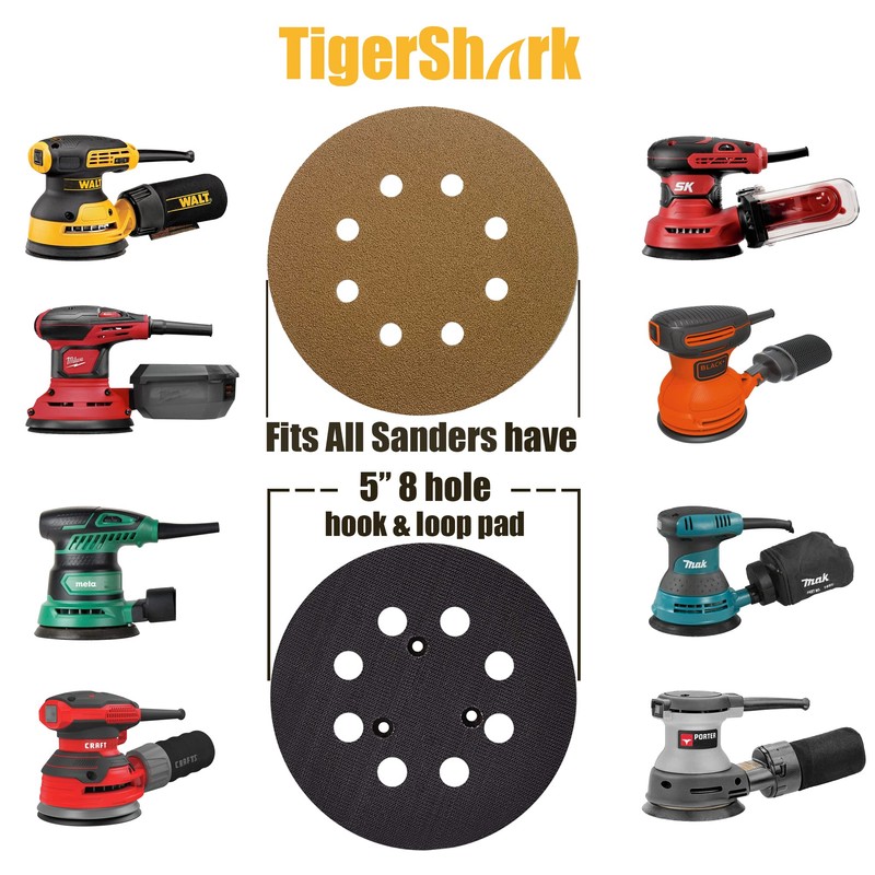 TigerShark 5 Inch 8 Hole Sanding Discs Grit 320 50pcs Pack Special Anti Clog Coating Paper Gold Line Hook and Loop Dustless Random Orbital Sander Paper Very Fine