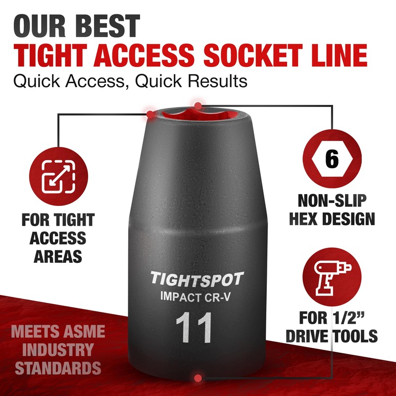 TIGHTSPOT 1/2 Inch Drive - 11mm Shallow Impact Socket with Anti-Rounding 6 Po...