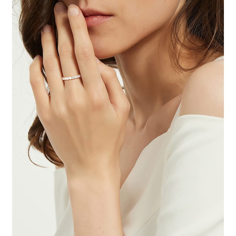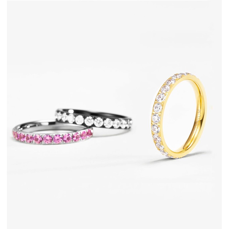 These eternity rings are set with beautiful high-quality cubic zirconia stones. Cubic Zirconia is a stone so optically close to a diamond. The man-made stone is virtually flawless whereas most diamonds have internal inclusions or external blemishes. It is a high-quality synthetic gemstone that imitates the appearance of diamonds. This means your stones will be sparkling and full of fire. Cubic zirconia is zirconium oxide (ZrO2), a mineral that is extremely rare in nature. Synthesized CZ is much less expensive than diamond, optically flawless, and can be created in a variety of different colors.