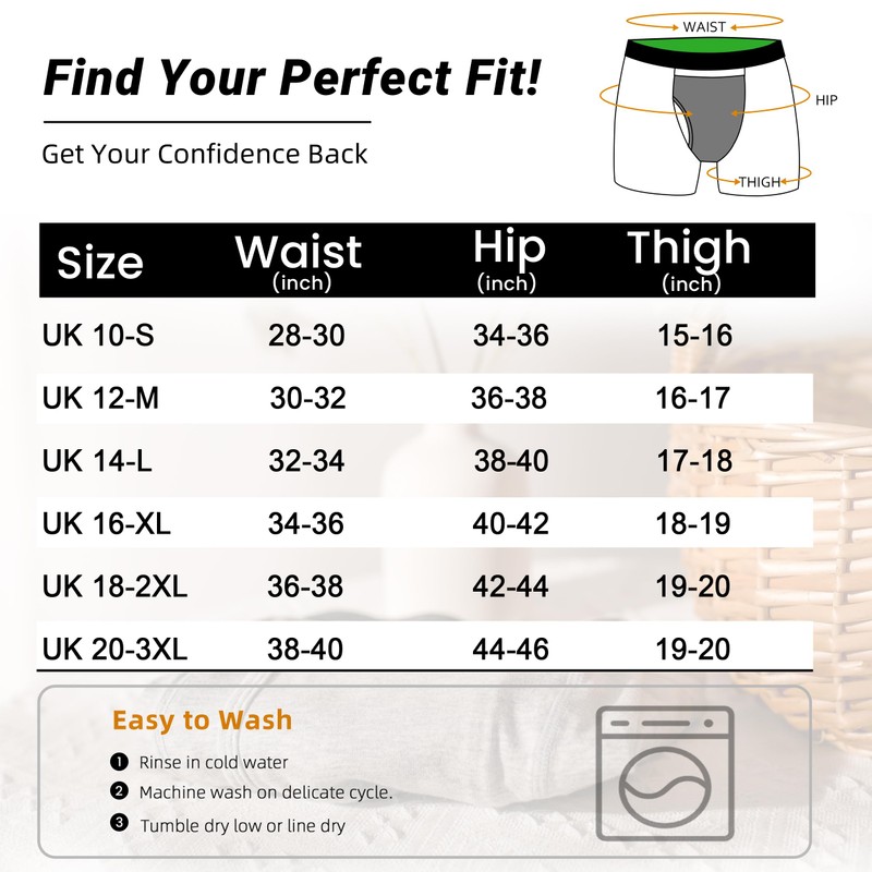 - Breathable and Discreet: The mens washable incontinence pants feature a 4-layer lining that extends to the thighs, providing a larger protective area. Moisture wicking materials keep the skin dry. From outside it's a regular boxer briefs with fly