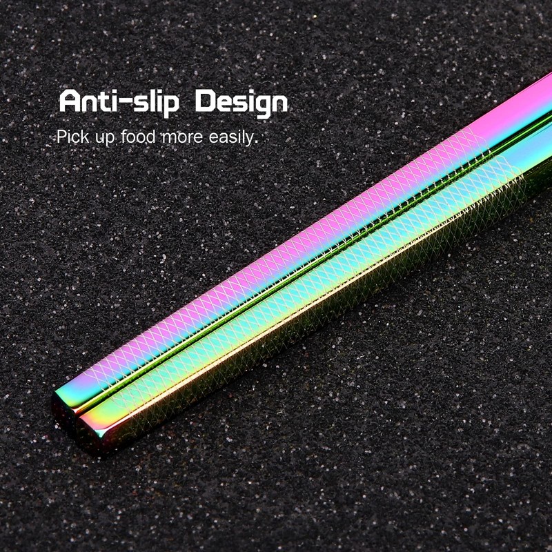 - 【Advanced Craftsmanship】High-quality 304 stainless steel material, with superb titanium plating and laser technology, makes the chopstick set present a unique color and wave pattern. At the same time, the bottom of the chopsticks has a non-slip effect, so there is no need to worry about food slipping.