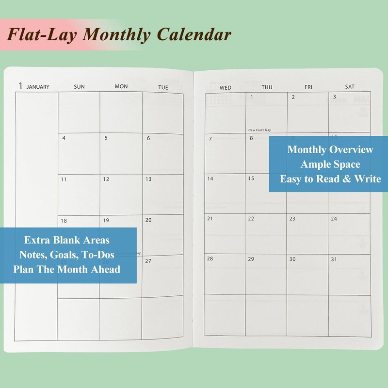 - Monthly Overview: Start each month with a 2-page spread Monthly Calendar, offering a quick and organized snapshot of upcoming events, deadlines, and important dates. The whole book ends with 2 extra pages of ruled, grid and dotted paper. Plan the year ahead, balance urgent agenda, and stay on top of your long-term goals with ease