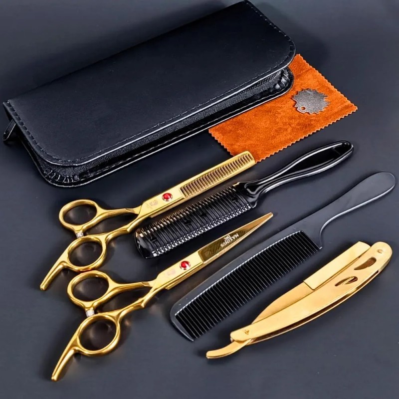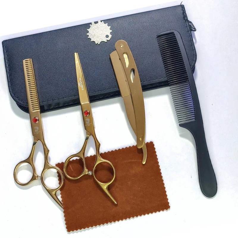 - **Portabilidad y Conveniencia**: Con su diseño compacto y su caja de almacenamiento incluida, nuestro kit de tijeras doradas es fácil de transportar y almacenar, lo que te permite llevar tus herramientas contigo a dondequiera que vayas y estar siempre preparado para realizar cortes profesionales en cualquier momento y lugar.