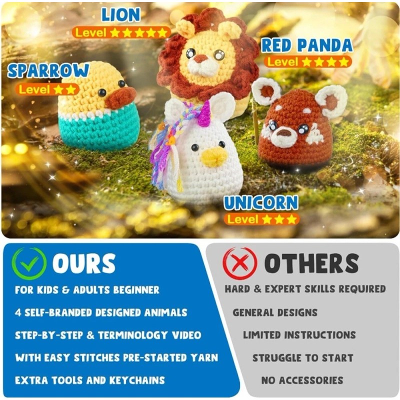 All‑In‑One Crochet Animal Kit: Includes premium acrylic yarn, ergonomic hook, needles, stuffing, safety eyes, and printed patterns to craft four cute animals—no extra supplies needed.