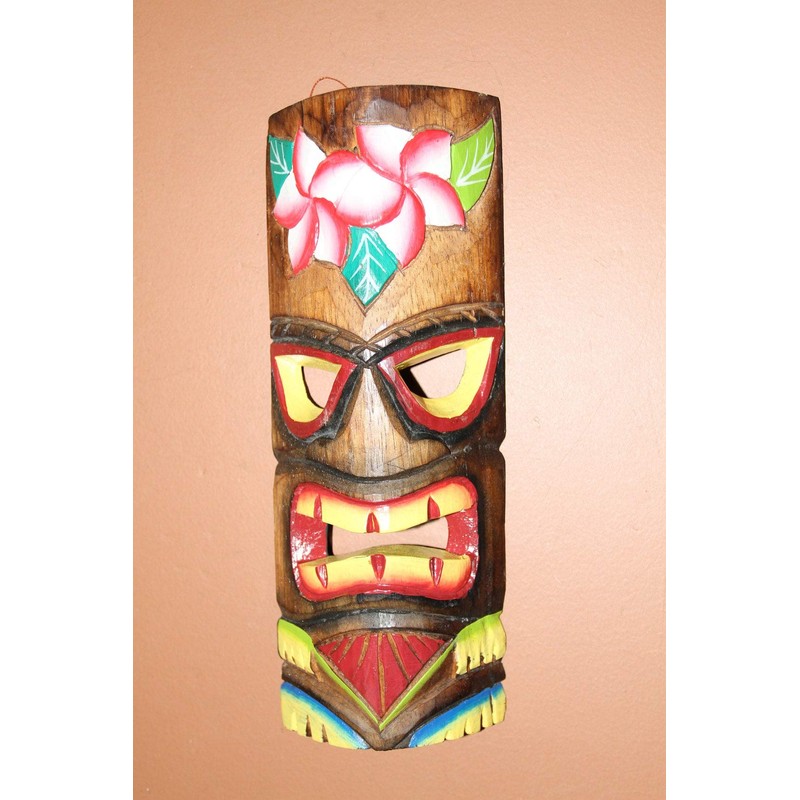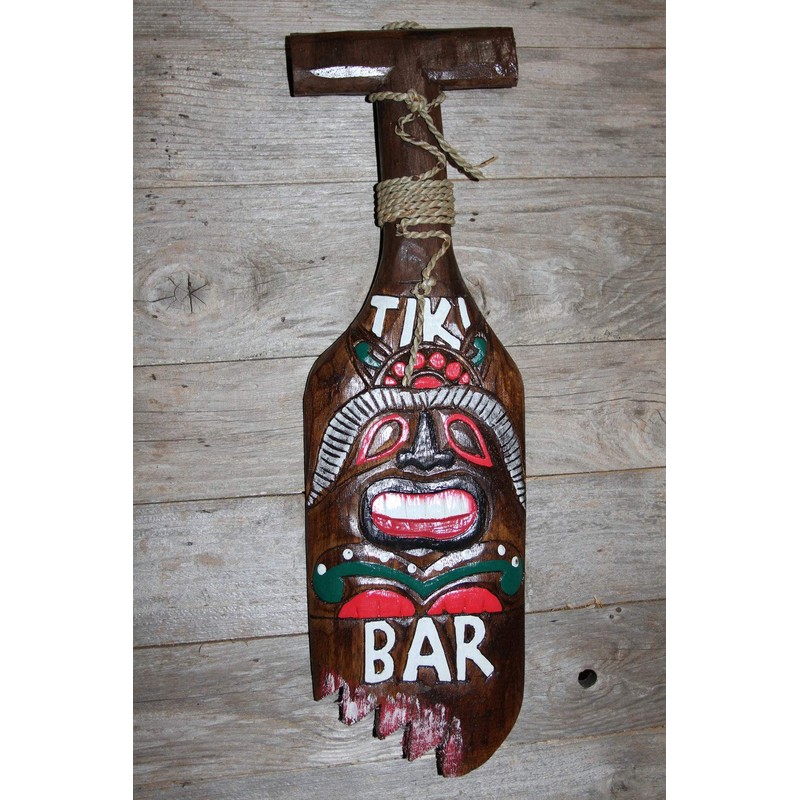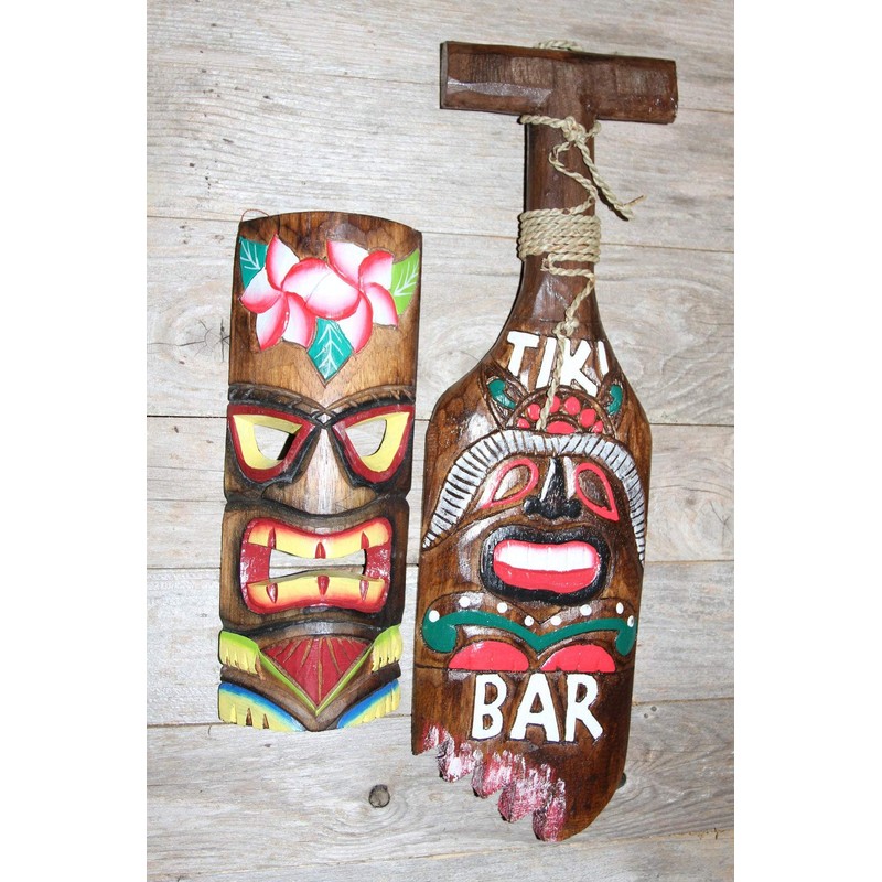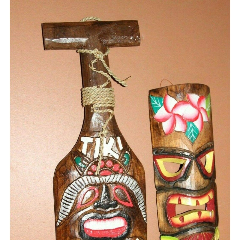 Hand painted tiki mask and shark bite paddle. Wood. These are hand-painted with vibrant colors. Great for the sunroom, covered deck, tiki bar, game room, home pub.... We do not hanging in direct sunlight as the UV rays will fade the colors over a period of time. These are hand-crafted and each one will be unique. The one that we ship to you will be like the one in the picture, but not exactly the same. Approximate sizes: Tiki mask is 4 1/4 inch by 11 3/4 inch. The paddle is 5 7/8 inch by 19 3/4 inch. Sizes are approximate as these are hand-crafted and they may vary slightly. Please let us know if this is a gift. We are more than happy to include a hand written message on one of our hand-made fold over photographic gift cards. These are hand crafted by families living in the South Sea Islands. They use all natural resources found on their island to make beautiful tiki decor, chimes & mobiles.
