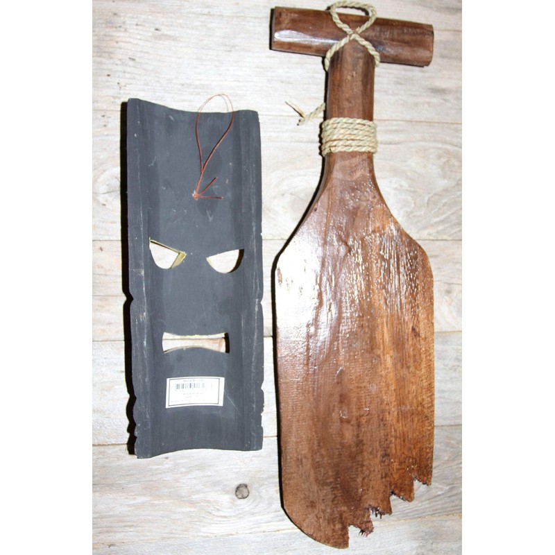 • Approximate sizes: tiki mask is about 4 1/4 inch by 11 3/4 inch.The shark bite paddle is about 5 7/8 inch by 19 3/4 inch. Sizes are approximate as these are hand-crafted and may vary slightly.