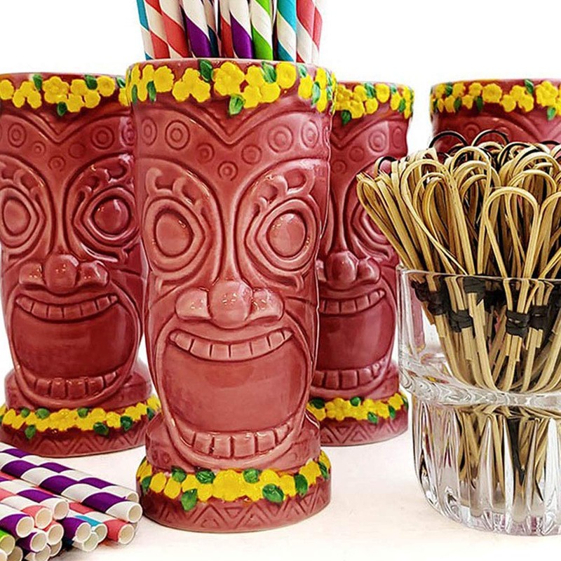 - ''' BarConic 12 oz. Tiki Goddess design#||# Made of Handcrafted Ceramic#||# Set of 4 Tiki Mugs#||# BarConic 100 pack Assorted Stripe Paper Straws#||# BarConic 100 pack Heart Bamboo Cocktail Picks'''