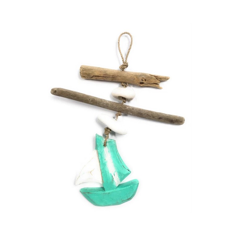 Here is a unique garland shaped like a boat with driftwood and white stone, measuring 12".