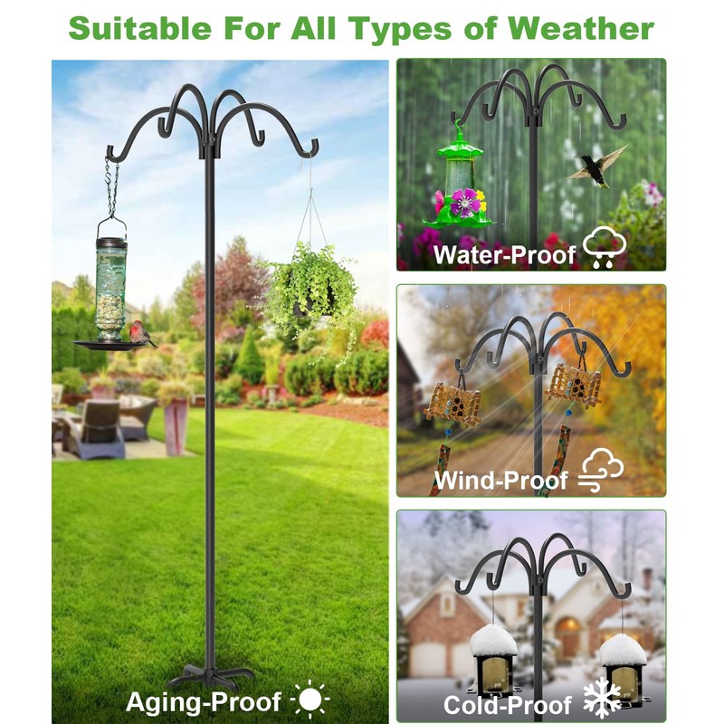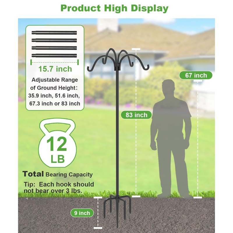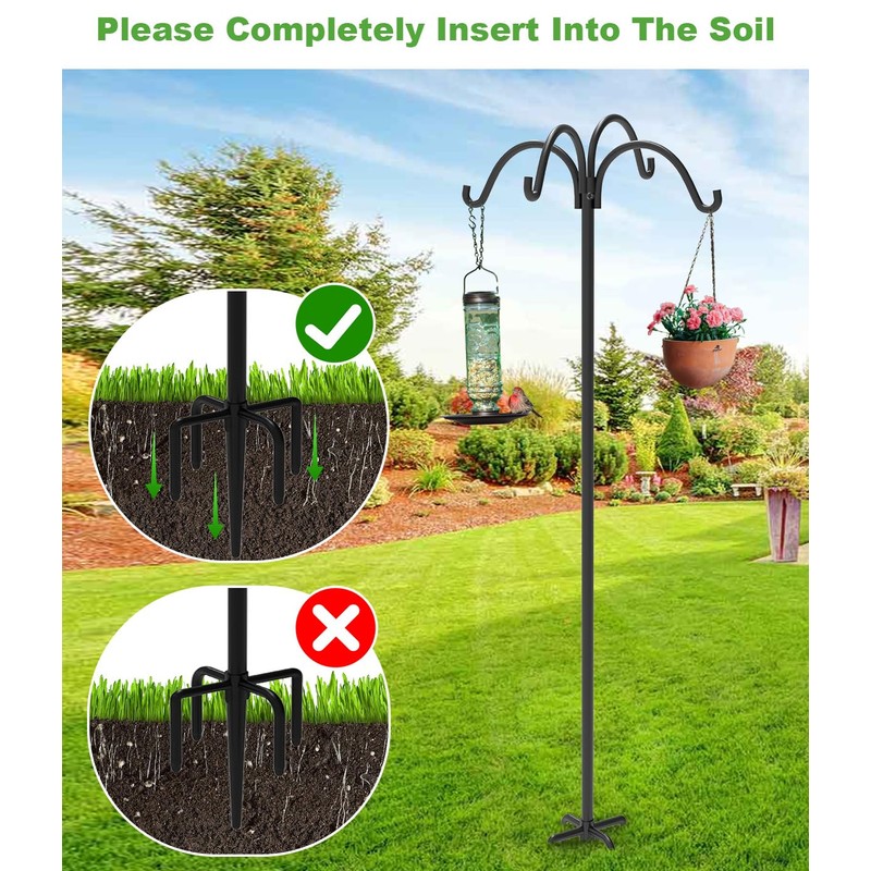 • 【Easy Installation】 Assembling the shepherds hooks for outdoor heavy duty is easy, taking just minutes. Tighten all rods in order and secure the extra double hook rods at the top for a 4-hook shepherd's hook. To keep stability, use your foot to fully insert the 5-Prong base into the ground. These bird feeder hangers are easy to disassemble, require minimal storage space, and offer convenient storage solutions.