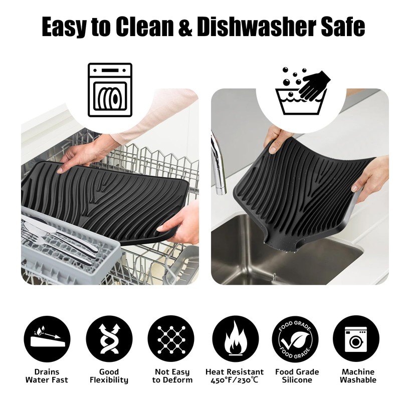 - Anti-slip & heat-resistant: TIKNIK non-slip easy clean sink mat has an anti-slip effect, which prevents tableware, vegetables, fruits and glassware from sliding off. It is also an excellent heat-resistant silicone dish drying mat that protects it from high temperatures up to 450°F/230°C, while protecting countertops and tables from hot pots or electrical appliances.