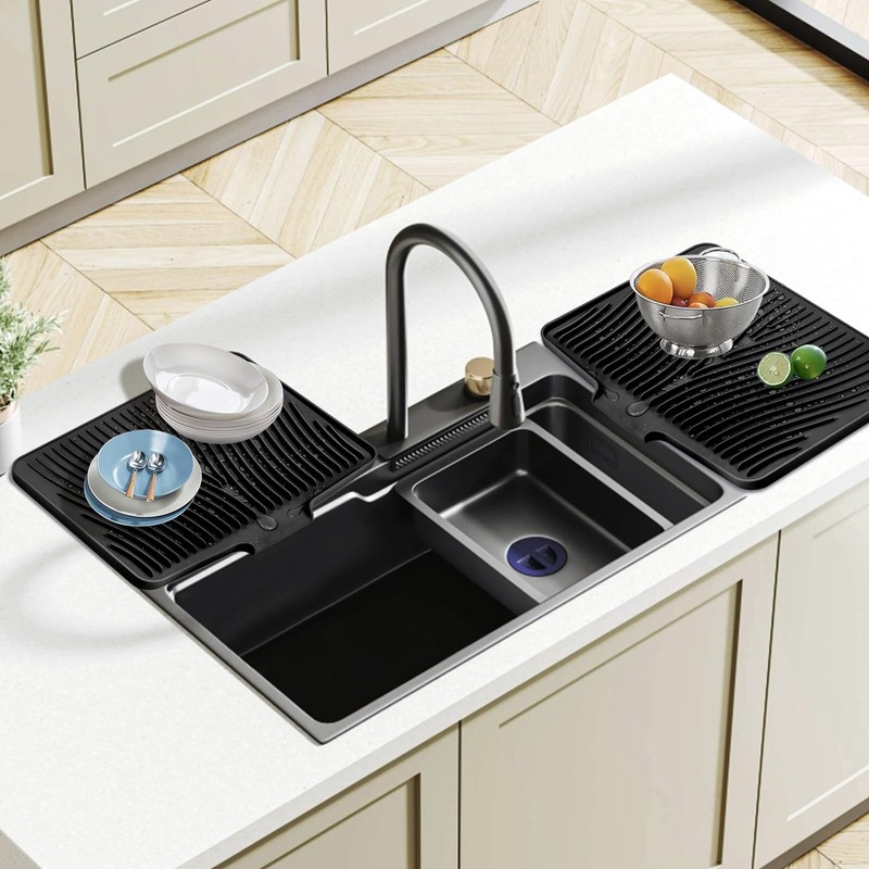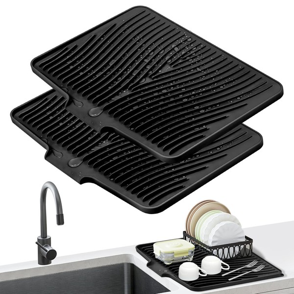 TIKNIK Dish Drying Mat, Stone Drying Mat for Kitchen Counter with Built-in Drain, Non-Slip Drying Matt Kitchen Counter, Heat Resistant Silicone Drying Mat, Dish Drying Pad, 2 Pcs (Black 19.7" x 17")
