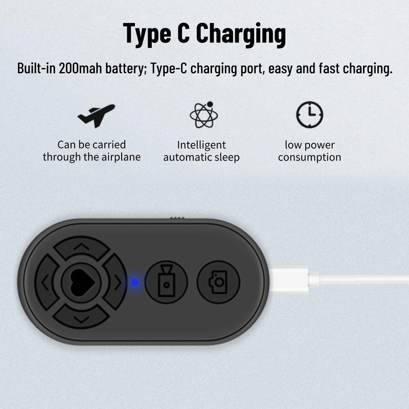 - CARGA TIPO C: Este botón selfie tiene una batería recargable incorporada y adopta una interfaz de carga tipo C, que es conveniente y rápida de cargar.