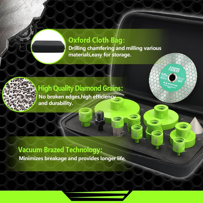 - 【Conveniently】Box packaging for easy storage and portability.Reasonable product collocation meets most work demands.The diamond finger bit and the beveling chamfer bit are cost-saving tools because you can create many different hole sizes without buying several different core bits.The diamond cutting grinding blade is included.