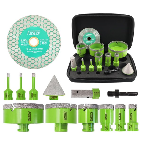 FACHLICH 13pcs 4" Diamond Core Drill Bits Set & 4.5" Diamond Cutting Blade for Tile, Granite, Marble & Stone