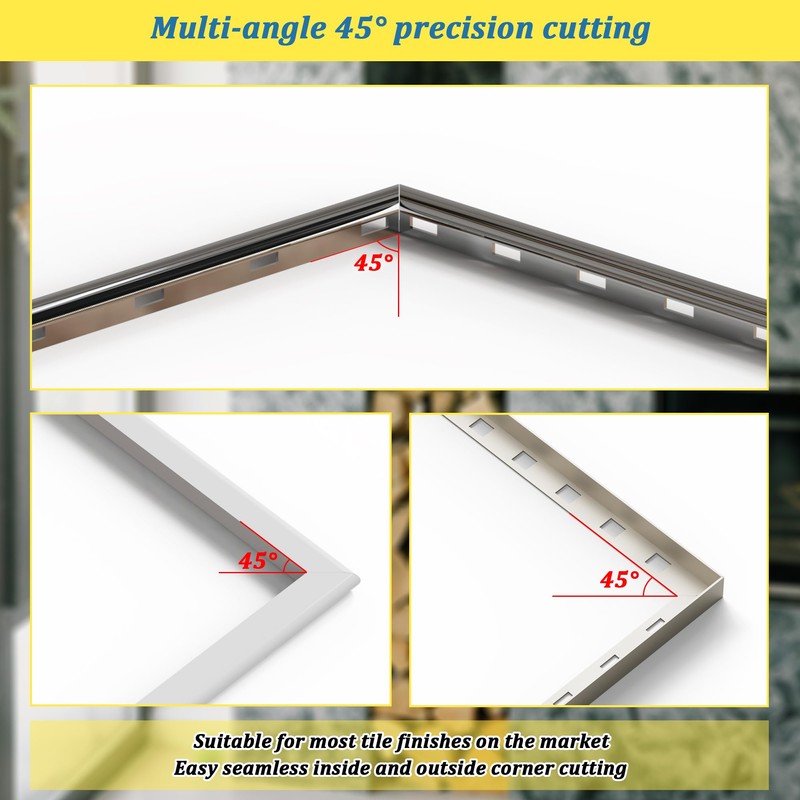 Simply measure the cutting length, snap the tile trim outline into the corresponding slots, and expose the part to be cut, fix the cut, and you can easily cuts perfect 45°angles!