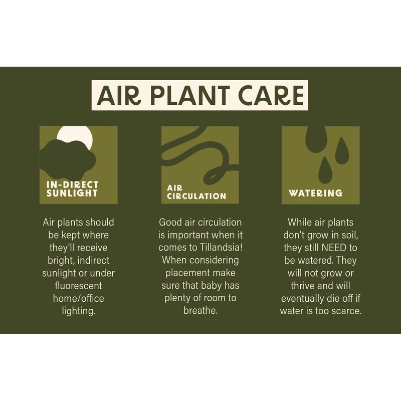 - EASY-TO-CARE-FOR: Air Plants (Genus: Tillandsia) are hardy bromeliad plants from Central and South America that don't require soil to grow. Simply soak them in water for 20 to 30 minutes once a week and let them dry out. They require indirect, but bright light. A care instruction card from Air Plant Shop will be included in every order.