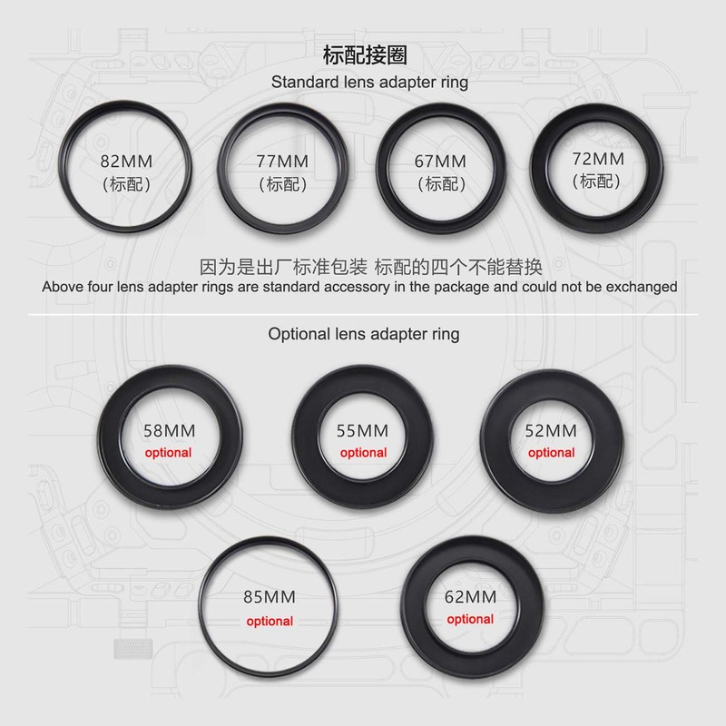 - It includes a mini matte box, a French flag, a 15mm single pole holder and lens adapter rings (82mm, 77mm, 67mm and 72mm). Other non-standard adapter rings (52mm, 55mm, 58mm, 62mm, 85mm) must be purchased separately.