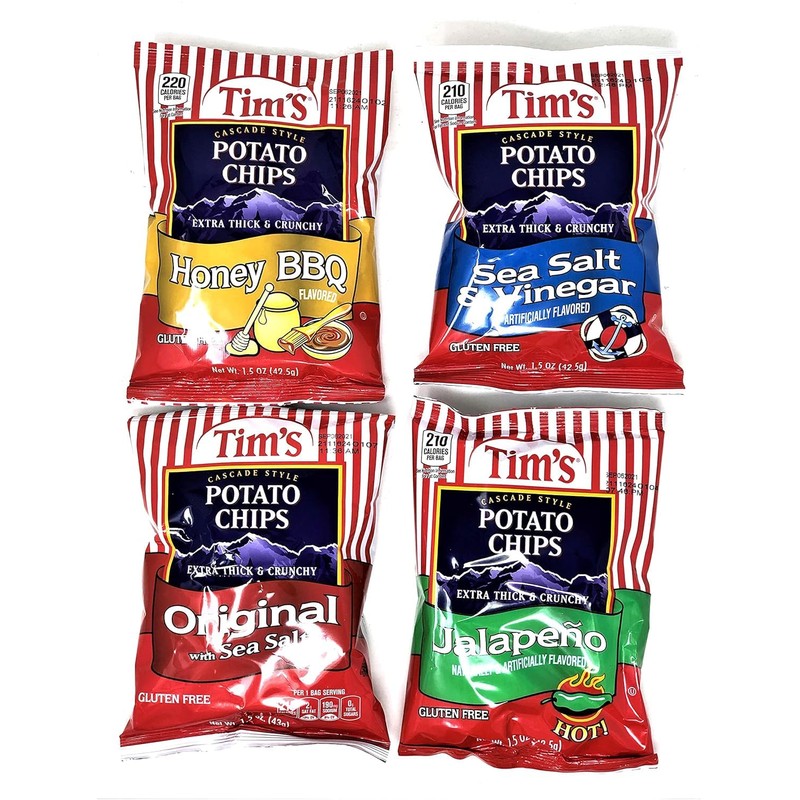 DTTB Tim's Cascade Style Potato Chips Sampler Pack with Tapatio Sauce! (Honey BBQ, Sea Salt & Vinegar, Original & Jalape 4 Count, 1.5oz Bags (4 Pack)