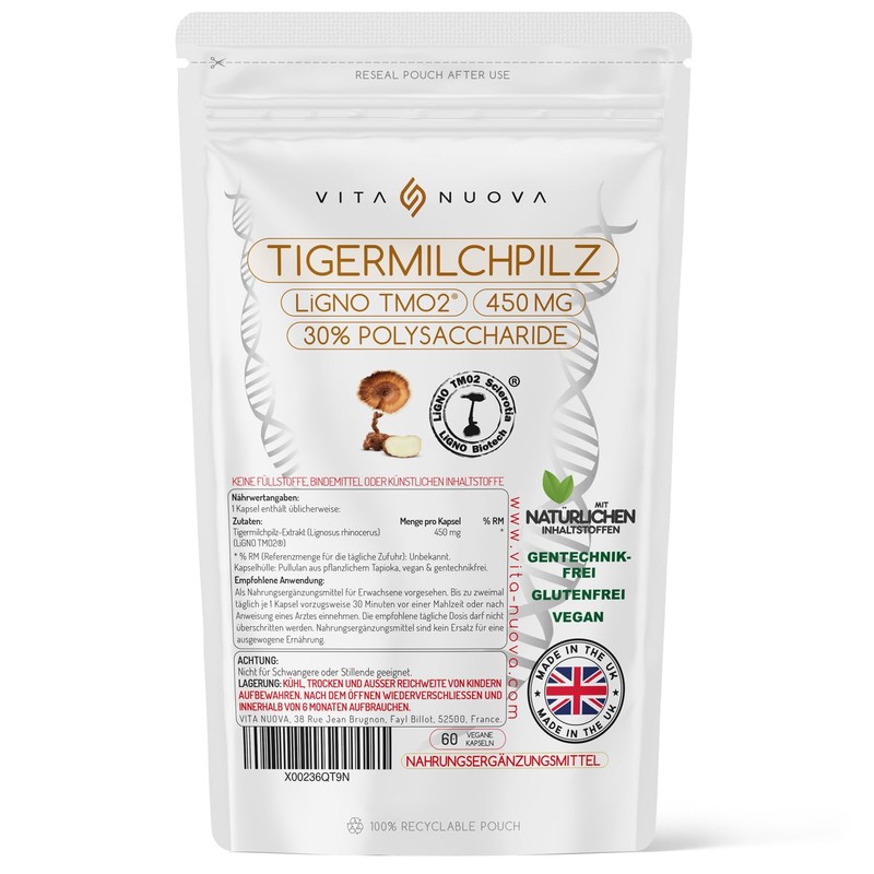 ProduktbeschreibungenNeu: Tigermilchpilz (Lignosus rhinocerus) C 60 Kapseln C LiGNO TMO2 C Ohne Zus?tze C GMP-Qualit?tssicherung C Vegan (60 Kapseln - Beutel)Inhaltsstoffe / Zutaten1 Kapsel enth?lt 1blicherweise: 450 mg Tigermilch-Pilzextrakt (Lignosus rhinocerus) (LiGNO TMO2?). Kapselh1lle: Pullulan aus pflanzlichem Tapioka, vegan & gentechnikfrei.GebrauchsanweisungAls Nahrungserg?nzungsmittel f1r Erwachsene vorgesehen. Bis zu zweimal t?glich je 1 Kapsel vorzugsweise 30 Minuten vor einer Mahlzeit oder nach Anweisung eines Arztes einnehmen.
