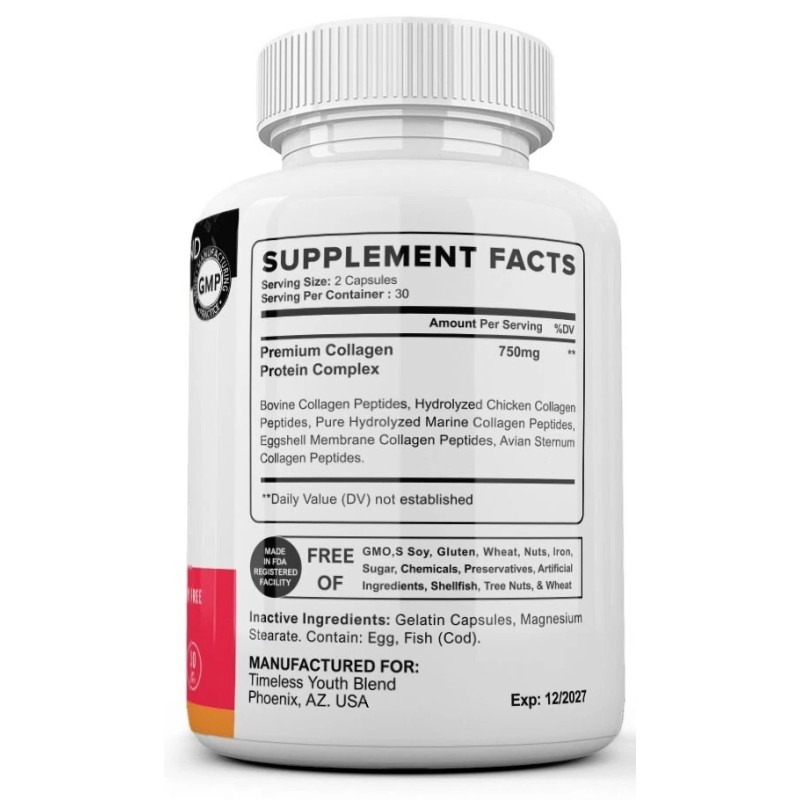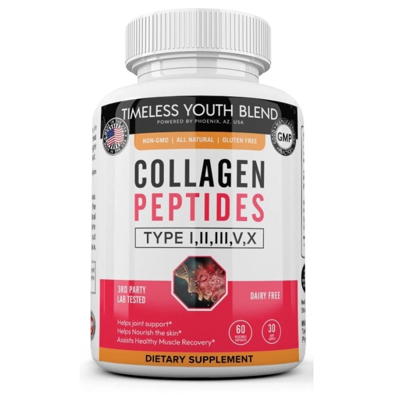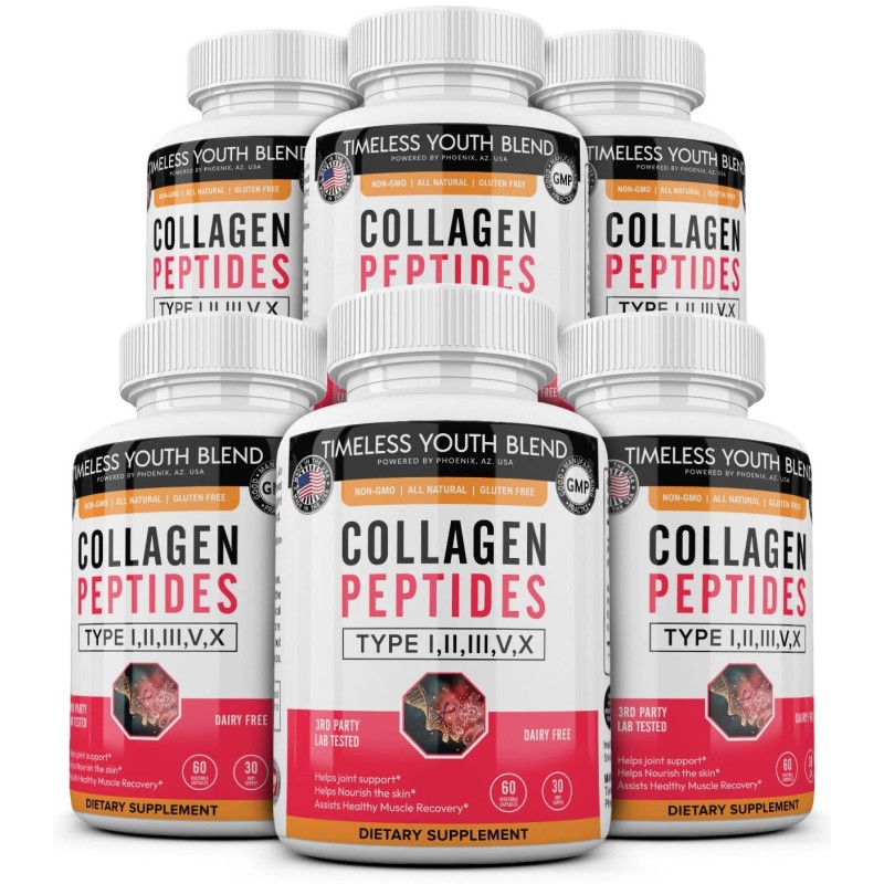 Timeless Youth Blend 6 Collagen Peptides Types I, II, III, V, X 1500mg Pills Anti-Aging Skin Capsules