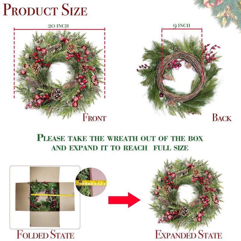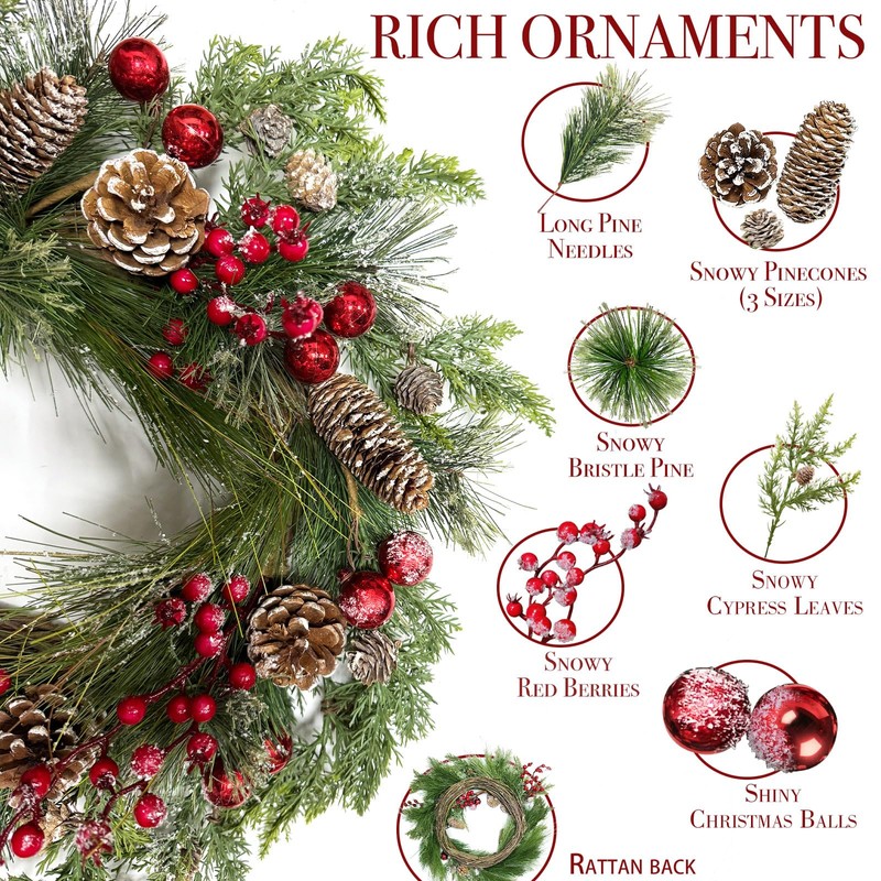 - 20 Inch Snowy Christmas Wreath: Our artificial wreaths for Christmas is 20” (D), with 30 lights, and full of rich ornaments: long pine needles, bristle pine, cypress leaves, pinecones (3 sizes), red berries, Christmas balls; Each ornaments is flocked