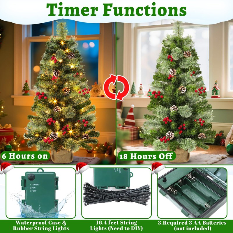 Timer - 3FT Christmas Tree, Small Table top Christmas Tree with 50 Warm White Lights, 72 Pine Branches 28 Smoky Pine Tips Pinecone Berry & Burlap Base Artificial Mini Xmas Tree for Indoor Home Decor