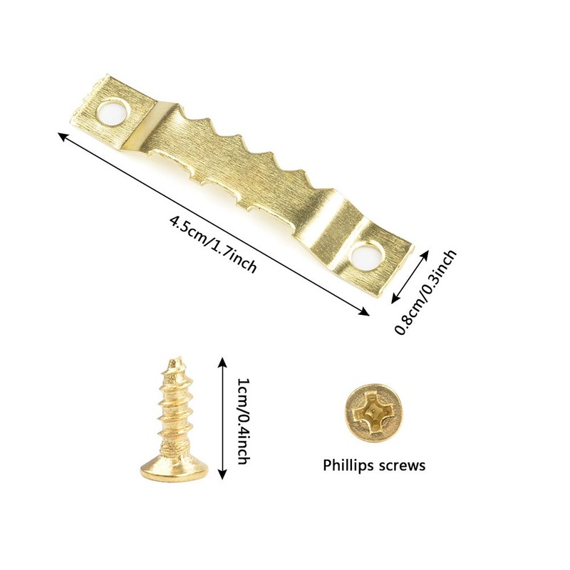 • High quality and with assortment box for storage: made of robust metal, nickel-plated, rust-proof, not easily broken. In addition, the box contains 100 pieces 45 x 8 mm sawtooth hangers and 200 pieces 7.5 x 12 mm screws, a sturdy plastic box with many compartments that are all beautifully sorted