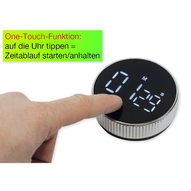 - The silver housing ring of the "Digi Disc" is not only name-giving, but central control element. By turning this ring to the left or right, the time is set, by tapping the LED display, the clock starts. The maximum adjustable time is 99 minutes and 55 seconds.