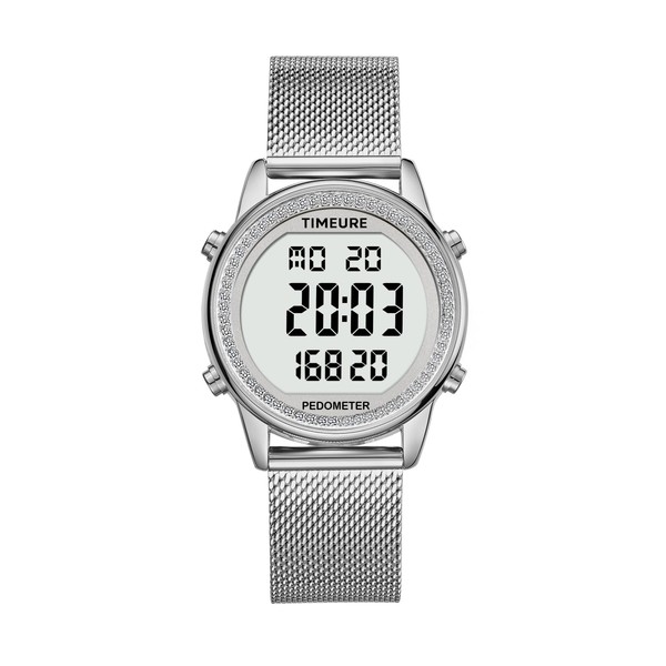 TIMEURE TU-2401 Women's Pedometer Watch, Stylish Design, Easy to Read Calories, Steps, Mileage, Countdown and Alarm with Backlight, Silver with diamonds, Bracelet