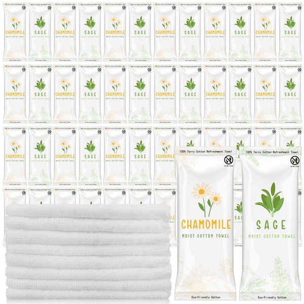 Timgle 50 Pcs Moist Towelettes Individually Wrapped Scented Disposable Face Towels Essential Oil Infused Moist Terry Cotton Towel for Use Hot or Cold Travel Body Spa(Sage, Chamomile)