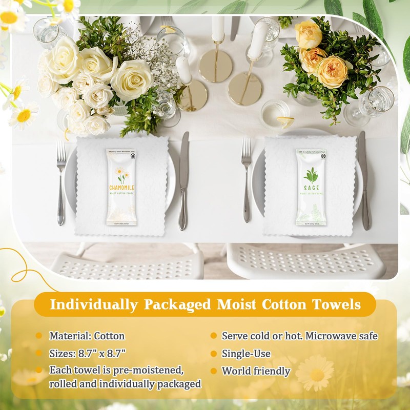 - Refreshing Sage and Chamomile Scent: infused with soothing essential oils, these scented towelettes individually wrapped can stimulate your senses, refreshing you instantly with sage and chamomile scent; Each use releases a subtle yet uplifting aroma, turning your towel-use into a luxurious, spa-like experience